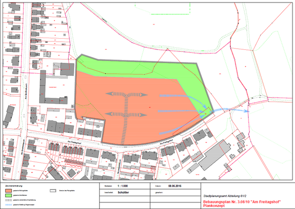 Bis zu 110 Wohneinheiten werden auf der bis jetzt landwirtschaftlichen grünen Wiese am Fuße der Sackgasse Am Freitagshof geplant. Seit Jahren schon im Flächen-nutzungsplan als Wohnbebauung ausgewiesen könnte man meinen, dass die Bebauung zu erwarten war.