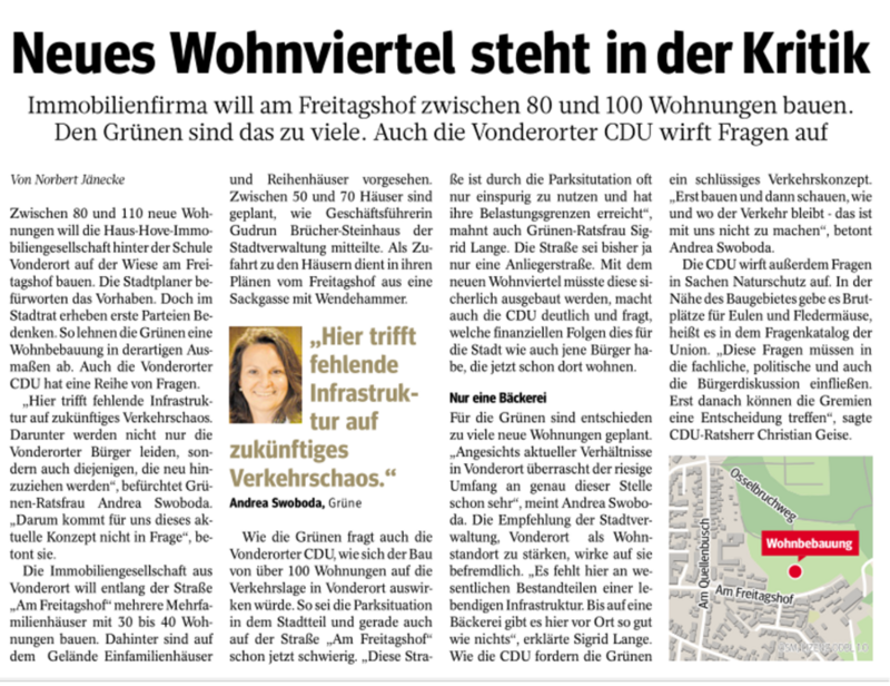 Doch angesichts aktueller Verhältnisse in Vonderort überrascht der riesige Umfang an genau dieser Stelle schon sehr. Die Umstände in Vonderort haben sich nach Meinung der GRÜNEN doch so sehr verändert, dass die Empfehlung der Stadtverwaltung „man begrüße die Stärkung des Siedlungsbereiches Vonderort als Wohnstandort“ schon befremdlich wirkt.