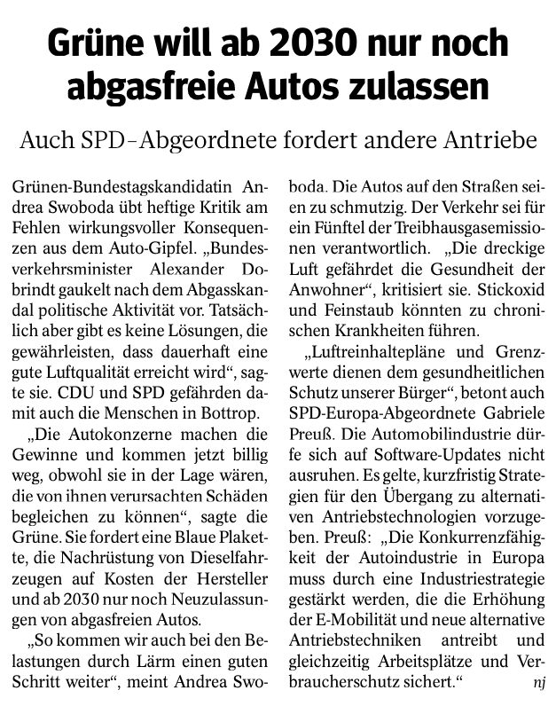 „Bundesverkehrsminister Alexander Dobrindt gaukelt nach dem Abgas-Skandal politische Aktivität vor. Tatsächlich aber gibt es bisher keine wirksamen Lösungen, die gewährleisten, dass dauerhaft eine gute Luftqualität erreicht wird. SPD und CDU sind Teil dieses Vorgehens und gefährden damit auch die Menschen in Bottrop, Gladbeck und Dorsten.