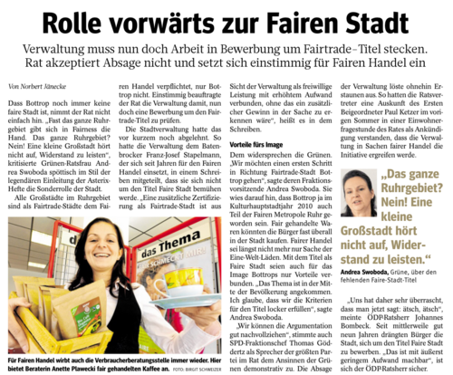 „So geht das nicht. Auch nicht in Bottrop. Auch hier sollte die Politik immer noch der Rat der Stadt machen. Und zwar zukunftsgewandt und verantwortungsvoll,“ kommentiert Andrea Swoboda, Fraktionsvorsitzende der Bottroper GRÜNEN, die Absage der Stadtverwaltung an die auch bürgerschaftliche Initiative zur Fairtradestadt.