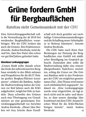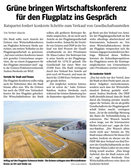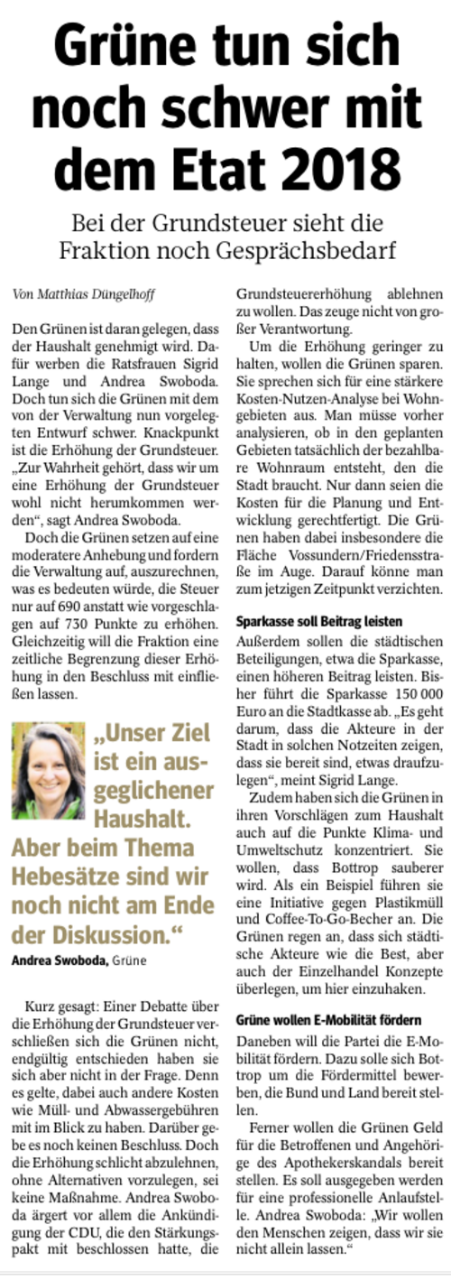 Andrea Swoboda (48 Jahre, Angestellte im Einzelhandel Bottrop, verheiratet, Mutter zweier Söhne – 8Jahre und 17Jahre) ist seit 2004 im Rat der Stadt Bottrop als Fraktionsvorsitzende und seit dem auch engagiert in den Finanzgremien der grünen Partei bis zum Bundesfinanzrat. Sie macht sich stark als Delegierte für den Landes- und Bundesparteitag für die Bottroper Positionen in Düsseldorf und Berlin und arbeitet zudem eng mit dem Bottroper Vorstand zusammen. Schon 2005 trat sie als Direktkandidatin zur Bundestagswahl an.