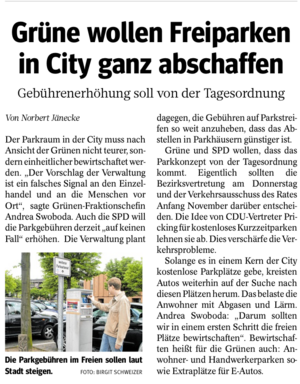 „Nein. Der Vorschlag der Verwaltung ist ein falsches Signal an den Einzelhandel und an die Menschen vor Ort und packt das Problem des Parkplatzsuchverkehrs nicht an der Wurzel an. Die Idee der Stadtverwaltung lässt Konzept und Tragweite vermissen.