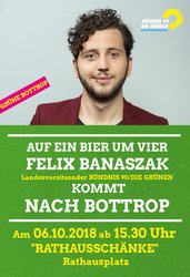 Am Samstag, dem 06.10.2018 ab 15.30 Uhr bis 18.00 Uhr in der "Rathausschänke" Kirchhellener Str. wollen die GRÜNEN mit den Bottropern ins Gespräch kommen und diesen auch gerne nach erfolgreichem Umzug von der Osterfelder Straße ihre neue Geschäftsstelle an der Kirchhellener Straße 16-18 genau gegenüber präsentieren. „Wir stellen unsere bisherige Arbeit in und für Bottrop vor und zeigen einen Ausblick auf die zukünftigen Themen wie die Förderung des Radverkehrs und des Grüns in der Stadt,“ so Andrea Swoboda für die Ratsfraktion und Joachim Gutsche für den Vorstand, der frisch gewählt seine Arbeit für die nächsten zwei Jahre aufgenommen hat.